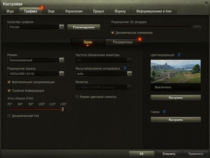 Остальные параметры, такие как: монитор, режим цветовой слепоты, цветокоррекция и гамма, которые находятся в окне «Экран» в настройках графики никак не влияют на производительность World of Tanks.